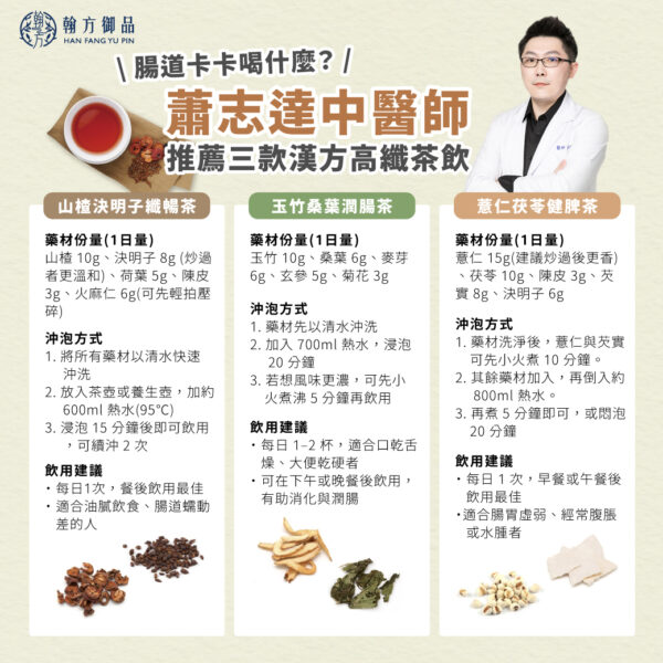 蕭志達中醫師指出,許多便秘或腸胃功能不佳的患者,其實與脾胃虛弱、氣機不暢有關。若能結合高纖中藥材如決明子、薏仁、火麻仁等,搭配具有健脾、潤腸、助消化功效的藥材,就能在日常中慢慢調整體質,讓排便更順、代謝更好。