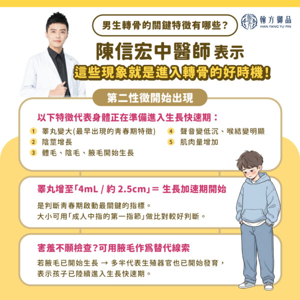 陳信宏中醫師分享當男孩第二性徵出現,代表身體已進入生長加速期,這正是男孩身高快速發展的關鍵階段!本篇將帶你完整了解男生轉骨長高的黃金時間、關鍵五大徵兆與補養原則,幫助家長安心陪孩子度過成長關鍵期。