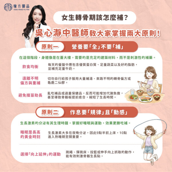 吳心瀞醫師提醒,轉骨關鍵不在「補得多或補得早」,而在「是否正確對應發育時機」。當女孩出現胸部發育、身高加速或食量增加等徵兆時,才是評估與調整體質的適當時機。透過專業評估搭配作息與飲食調整,通常比過早或過度進補更安全也更有效。