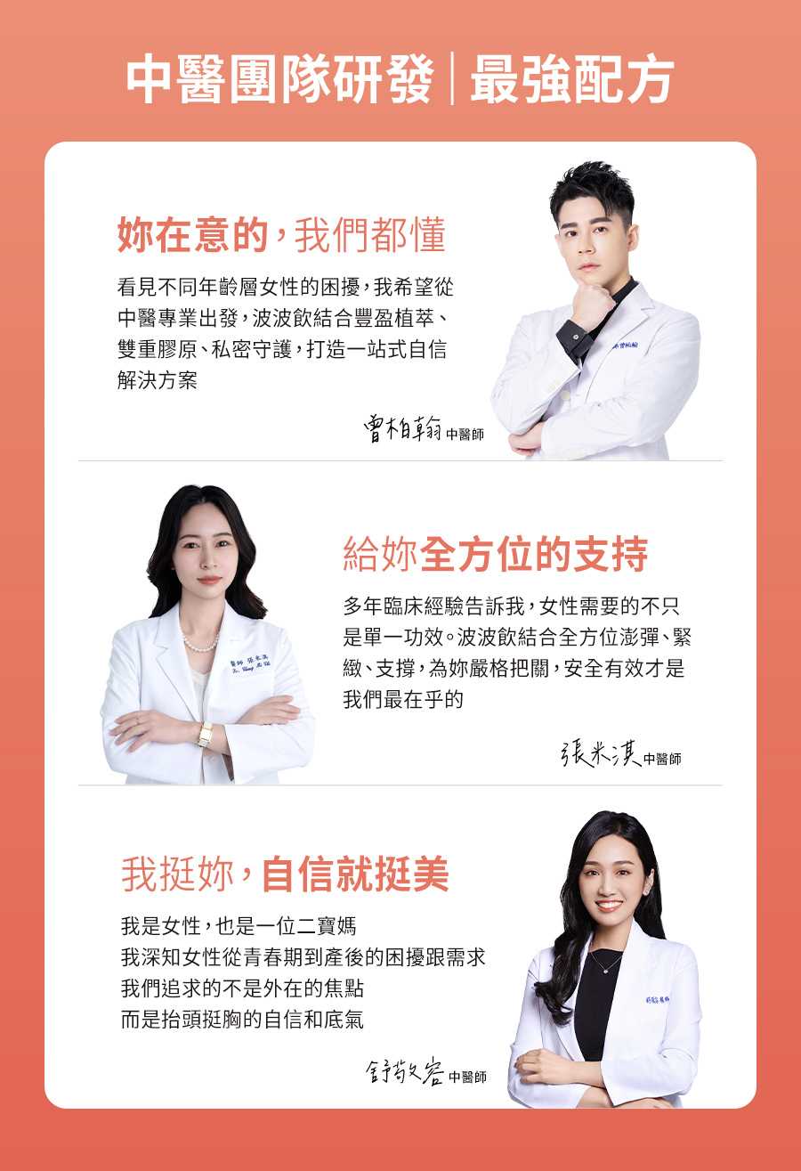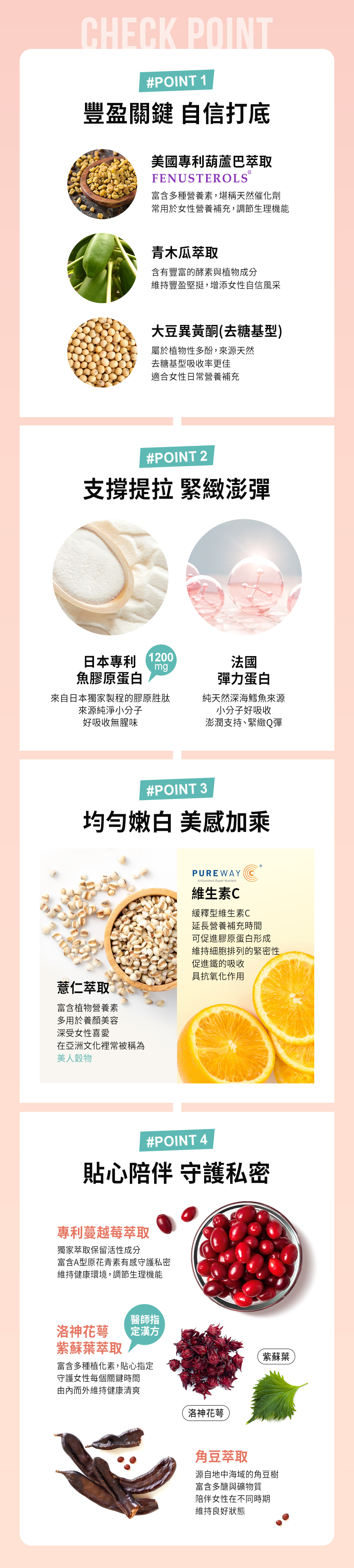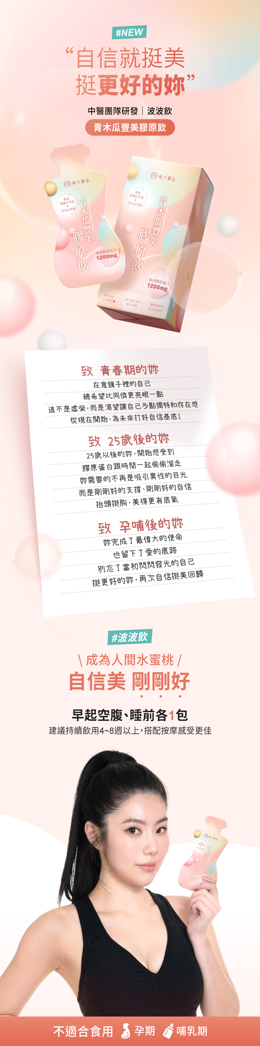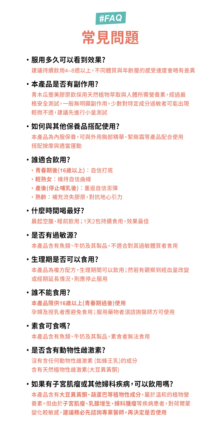 Q:服用多久可以看到效果? A:建議持續飲用 4–8 週以上,不同體質與年齡層的感受速度會略有差異 Q:本產品是否有副作用? A:本品採用天然植物萃取與人體所需營養素,經過嚴格安全測試,一般無明顯副作用。少數對特定成分過敏者可能出現輕微不適,建議先進行小量測試 Q:如何與其他保養品搭配使用? A:本產品為內服保養,可與外用胸部精華、緊緻霜等產品配合使用,搭配按摩與適當運動更佳 Q:誰適合飲用? 青春期後(16歲以上):自信打底 輕熟女:維持自信曲線 產後(停止哺乳後):重返自信澎彈 熟齡:補充流失膠原,對抗地心引力 Q:什麼時間喝最好? A:晨起空腹、睡前飲用;1天2包持續食用最佳 Q:是否有過敏源? A:本產品含有魚類、牛奶及其製品,不適合對其過敏體質者食用 Q:生理期是否可以食用 A:本產品為複方配方,生理期間可以飲用;然若有觀察到經血量改變,或經期延長情況,則應停止服用 Q:誰不能食用? A:本產品限供16歲以上(青春期過後)使用,孕婦及授乳者應避免食用;服用藥物者須諮詢醫師方可使用 Q:素食可食嗎? A:本產品含有魚類、牛奶及其製品,素食者無法食用 Q:是否含有動物性雌激素 A:沒有含任何動物性雌激素 (如蜂王乳)的成分;含有天然植物性雌激素(大豆異黃酮) Q:如果有子宮肌瘤或其他婦科疾病,可以飲用嗎? A:本產品含有 大豆異黃酮、葫蘆巴等植物性成分,屬於溫和的植物營養素。 但由於 子宮肌瘤、乳腺增生、婦科腫瘤 等疾病患者,對荷爾蒙變化較敏感,建議務必先諮詢專業醫師,再決定是否使用。
