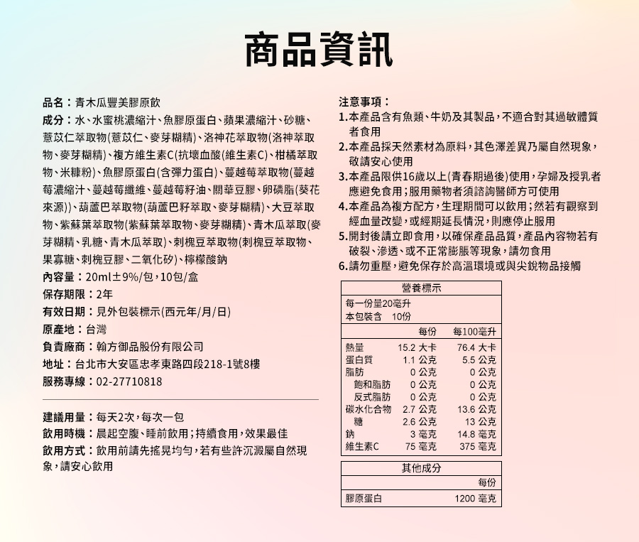 | 注意事項 | 本產品限供16歲以上(青春期過後)使用,食用前請先確認原料,如有食物過敏體質、特殊體質/病症、正在服用其他藥物,請先諮詢醫師,依照醫囑或個人身體狀況食用。孕婦、哺乳期請暫停飲用。 |
