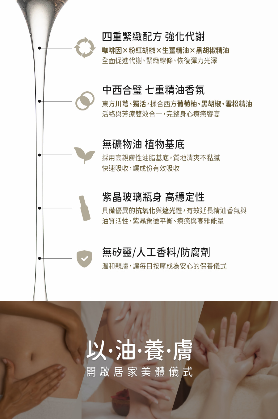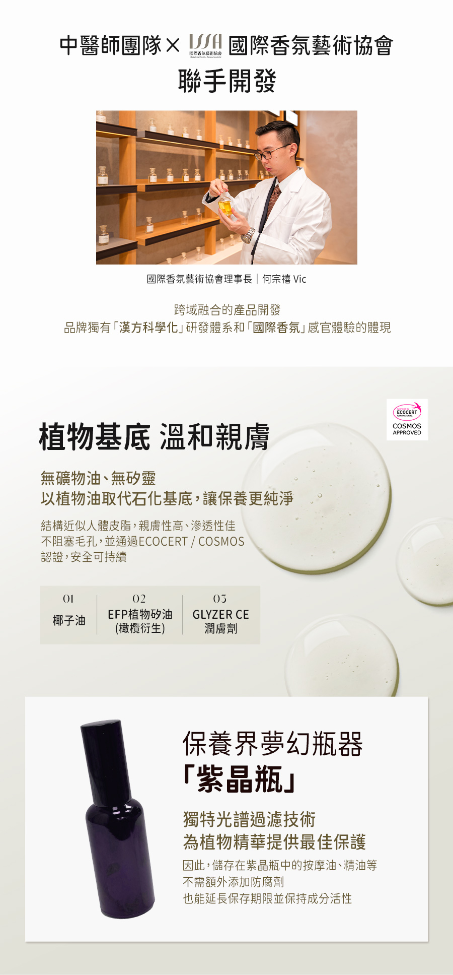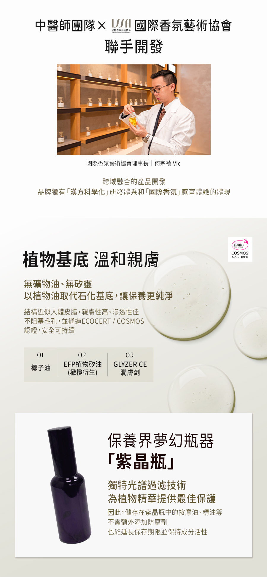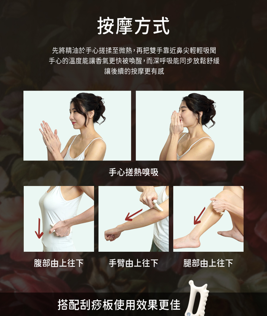 專業中醫團隊 × 國際香氛藝術協會 聯合開發 🔸中西合併|七重精油香氛 🔸溫和親膚|無礦物油、100%植物基底 🔸高穩定性|紫晶玻璃瓶 獨特濾光技術 🔸安心配方|無矽靈/人工香料/防腐劑 🔸搭配刮痧板按摩效果更顯著