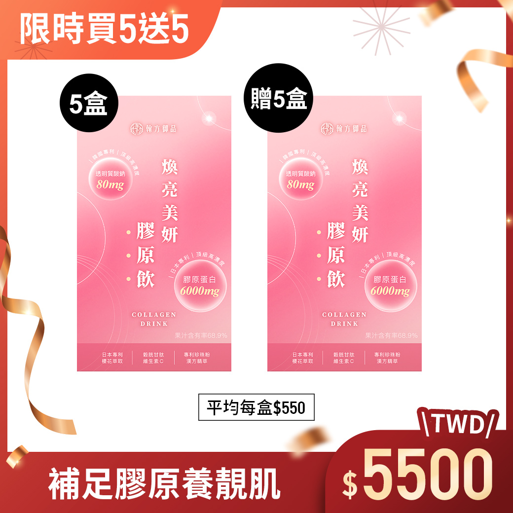 A: 白天,空腹喝「煥亮美妍膠原飲」: 日本專利膠原蛋白6000mg結合韓國專利玻尿酸、八重櫻萃取、維生素C,再加上珍珠粉、薏仁等漢方成分,實現澎!潤!透!亮!